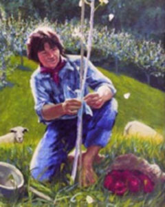I decided to paint Johnny shoring up a sapling. I chose the simplest of light around 9 in the morning. It spoke of the beginning of a work-day. It set my pallet of colors to be limited. The degrees of contrast would soften as we looked past the man, the sheep, and the wing’s eagle. The apples provided a color contrast, but David’s (David Onstandt who drove truck for a local specialty food outlet) face, hands, and foot told the day’s temperature. The grasses in the patchwork of meadows deepen the farther up the hill. In the early morning, sometimes, the gray of a tree’s bark takes on the color blue, and we believe that to be true.